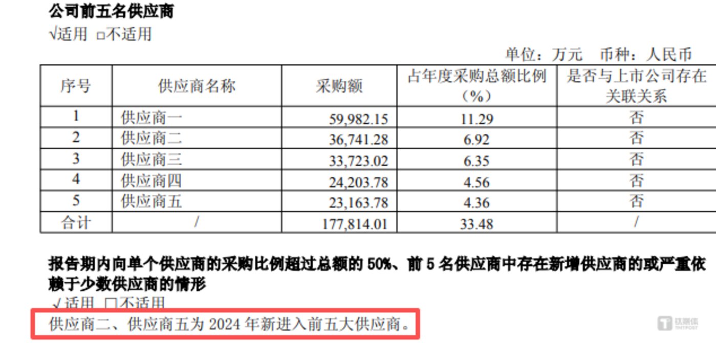 除关联与依赖问题外,恒运昌与拓荆科技的交易数据还存在明显矛盾。Choice 金融终端显示,2024 年拓荆科技的前五大客户和前五大供应商的具体情况如下: