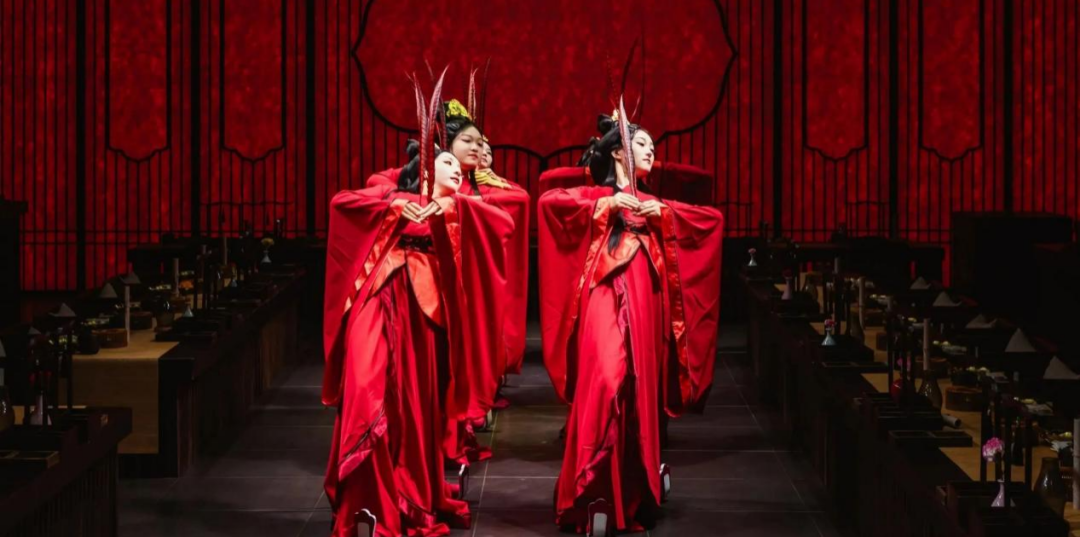 一进门,就有“ 侍卫” 和“ 宫女” 作揖行礼,入座后,又有专人奉茶、伺候沐手、焚香,还没等人回过神来,奏乐响起,台下宾客已经在一场接一场的舞剧中品尝佳肴。