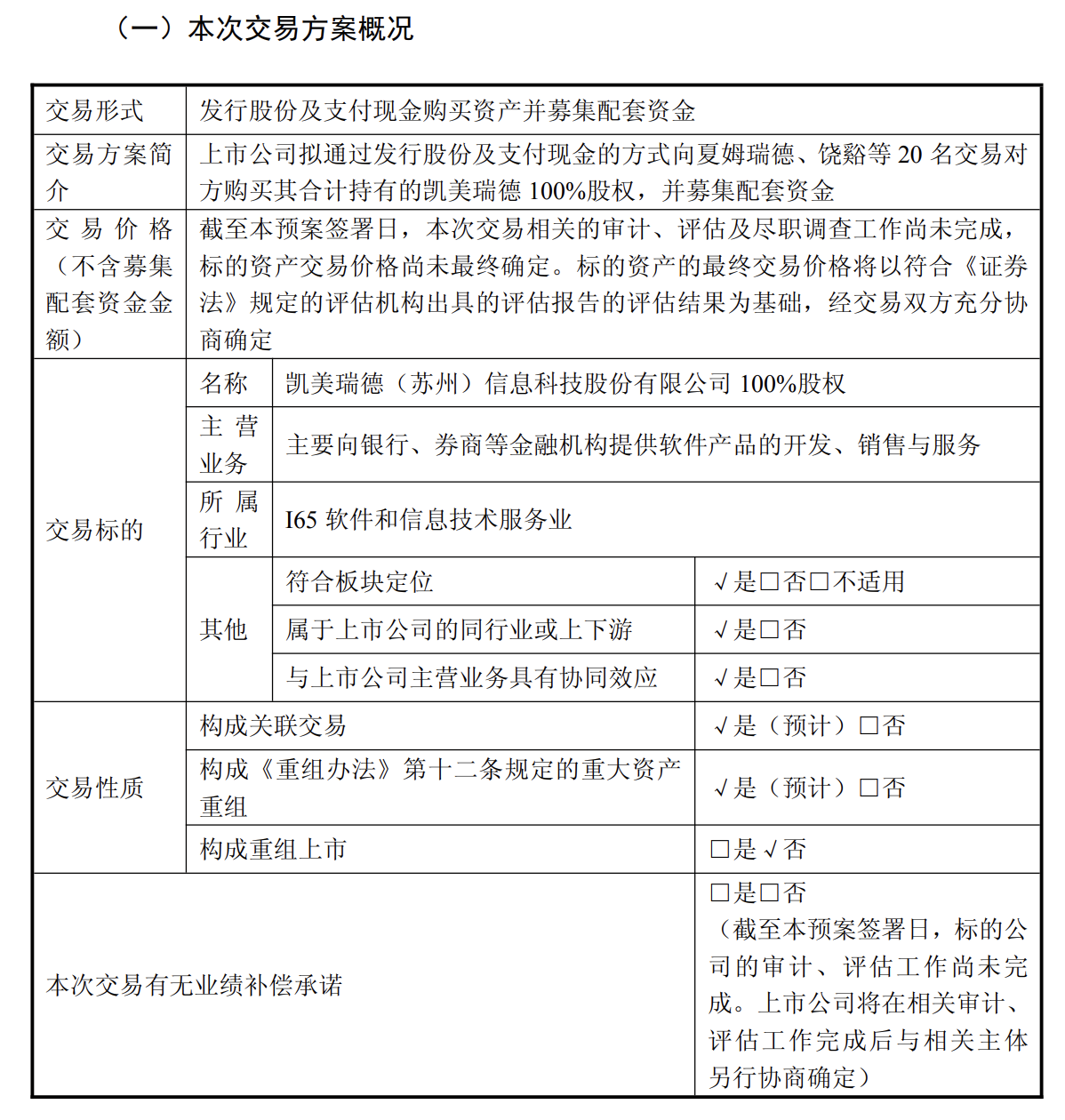 11 月 11 日,凌志软件(688588.SH) 复牌并披露并购预案,拟通过发行股份及支付现金方式购买凯美瑞德 (苏州) 信息科技股份有限公司 (下称“ 标的” 或“ 凯美瑞德”)100% 股权,并同步募集配套资金。该笔交易预计构成重大资产重组,交易价格等核心信息有待标的估值确定后进一步披露。