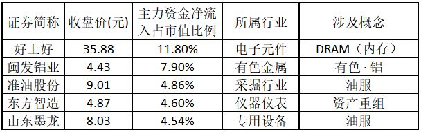 主力资金净流入金额占市值比例排名前 5 的个股分别为好上好、闽发铝业、准油股份、东方智造、山东墨龙。