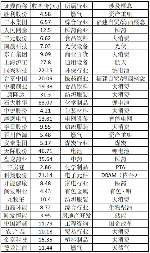 涨停板个股中,股价创出近一年新高的个股有 30 只 (不包括创出历史新高的个股),包括胜利股份、三木集团、人民同泰、三元股份、国晟科技、东百集团、上海沪工、同兴科技、合富中国、中粮糖业、康隆达、石大胜华、中锐股份、摩恩电气、孚日股份、百川能源、安泰集团、天际股份、盘龙药业、三房巷、科翔股份、开能健康、闽发铝业、九牧王、山高环能、顺发恒能、中国海诚、农产品、金富科技、德龙汇能,具体如下表所示。