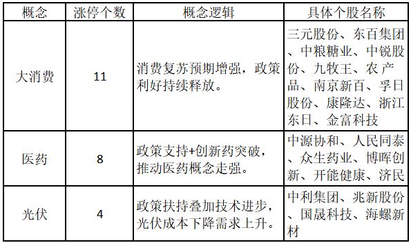 从概念特征来看,今日涨停板个股中,大消费、医药、光伏概念的个股最多。