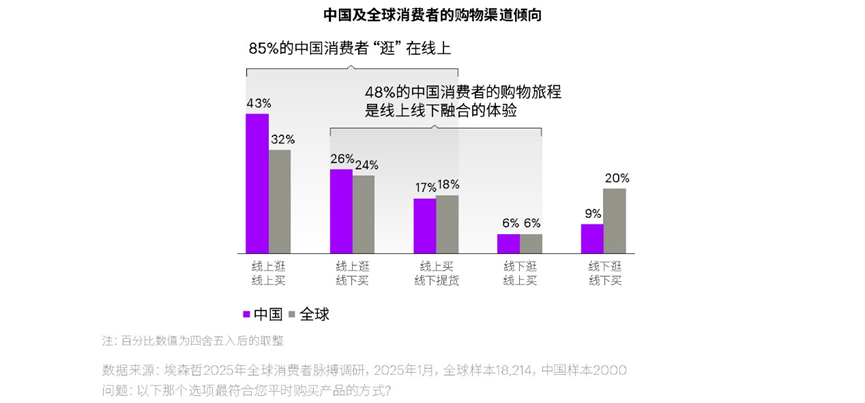 中国消费者的购物渠道偏好呈现出独特特征:85% 的中国消费者“ 逛” 在线上,远高于全球平均水平。其中 43% 习惯线上逛、线上买,42% 选择线上逛、线下买,形成独特的线上线下融合模式。