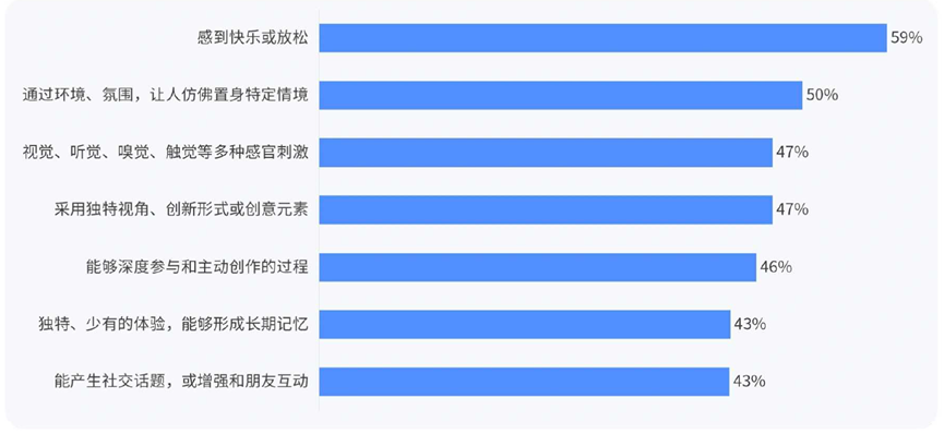 倍市得报告显示,消费者对体验式消费的核心期待包括“ 感到快乐或放松”(59%)、“ 环境氛围让人置身特定情境”(50%)、“ 多感官刺激”(47%) 和“ 能深度参与创作”(46%)。消费过程本身成为情感疗愈和社交连接的场合。