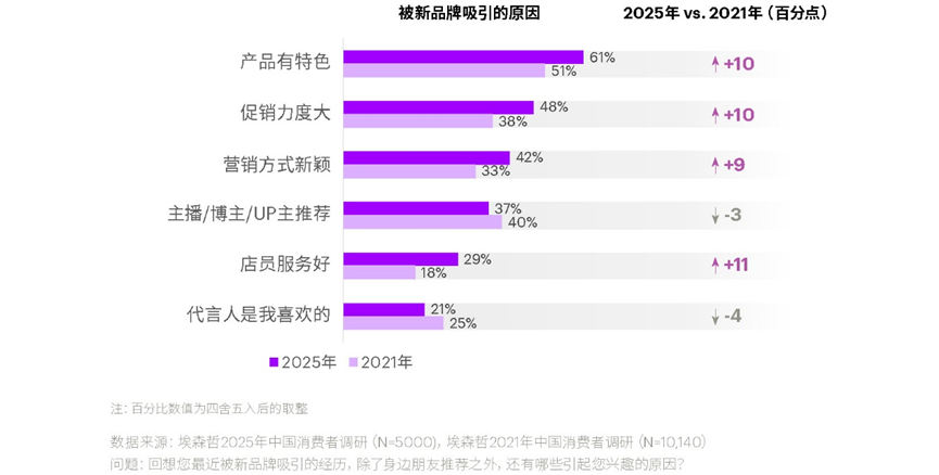 信任机制的重构加剧了这一趋势。产品特色、促销力度和营销新颖度对吸引新客户的影响力大幅提升约 10 个百分点,而主播推荐和明星代言的影响力则明显下降。消费者不再盲从 KOL,而是更相信自己的判断力。