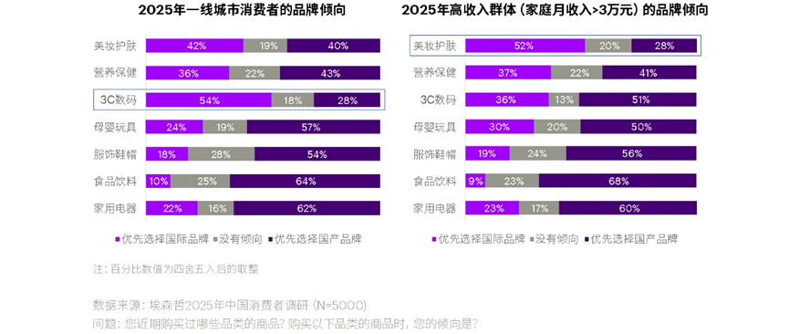 图 (左):超半数的一线城市受访者在 3C 数码品类倾向国际品牌,
