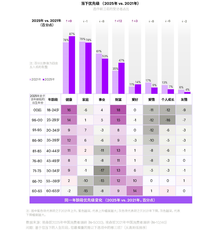 数据揭示了一个明显的趋势:中国消费者的心态正在从理想主义向现实主义收缩。对健康和财富的关注度分别上升 9 个和 8 个百分点,而对事业、爱情和个人成长的重视程度则全面下降。