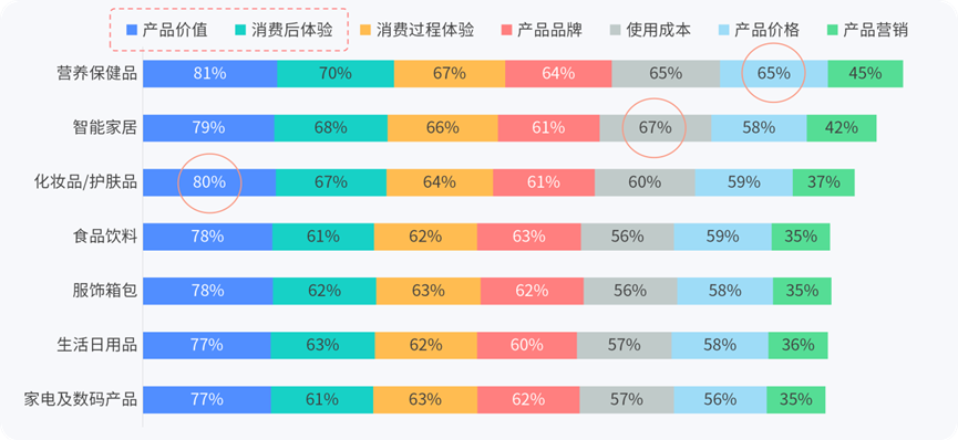 这一趋势在不同品类中呈现出差异化表现。智能家居消费者更关注“ 使用成本”(67%),反映对长期体验的考量;化妆品/护肤品则兼顾“ 产品价值”(80%) 与“ 情绪体验”。