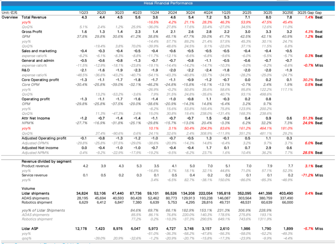 整体来看,禾赛于北京时间 11 月 11 日港股盘后发布了 2025 年三季度财报。此次禾赛又再次交出一份非常不错的财报,同时还上调了 2025 年全年业绩指引,具体来看: