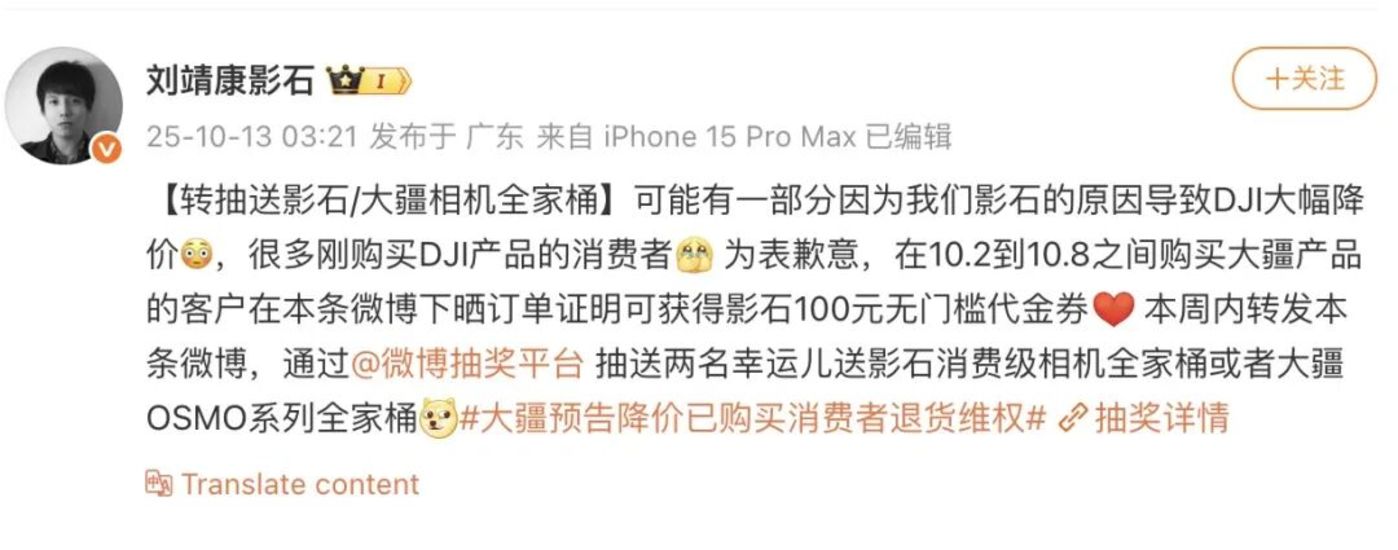 但颇为耐人寻味的是,这厢大疆尚未就降价一事表态,那厢影石 CEO 刘靖康却抢先一步 「代位道歉」 了。