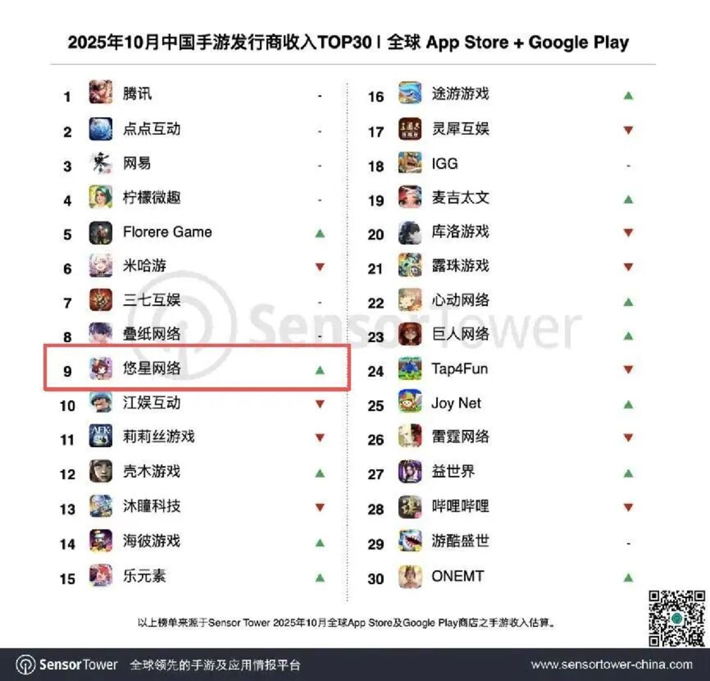 凭借在日本市场的活跃,悠星一直是中国手游发行商收入榜单上的常客。Sensor Tower 最近的数据显示,10 月,悠星依然稳稳位列榜单 top10。榜单细则中,除了提到上述老牌二游的贡献之外,还特别指出了悠星自研自发的新产品 《星塔旅人》 带来的新增长。