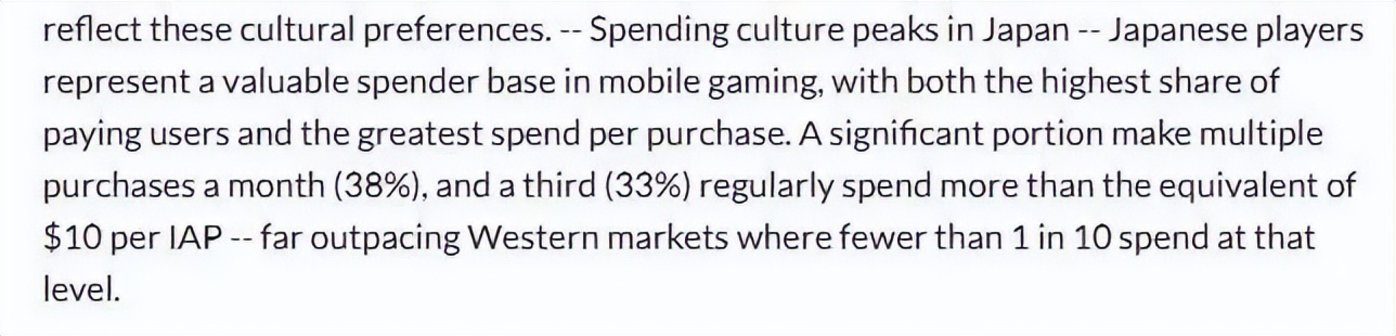 日本的玩家不仅付费用户比例最高,单次购买金额也最高。调查显示,有 38% 的日本玩家每个月有着多次游戏内付费行为,其中,还有三分之一的玩家每次应用内购买的金额超过 10 美元,这组数据远超西方市场,西方市场只有不到十分之一的玩家达到这一消费水平。