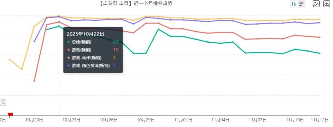 日本隔壁的韩国市场,《星塔旅人》 的表现也可圈可点,最高也冲到了总榜前 30 的位置。