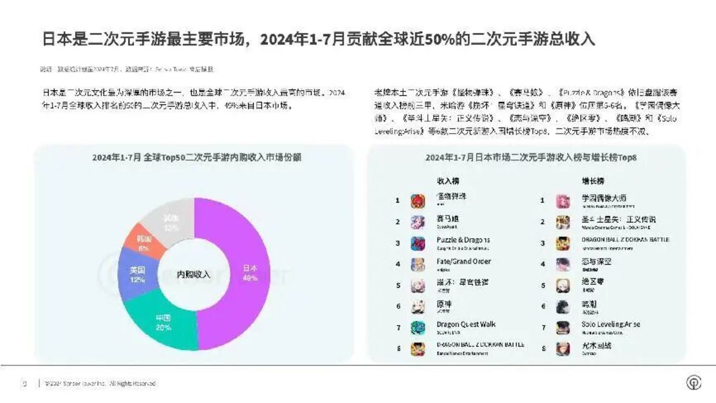 注意,这里我们还需要指出,日本的移动端市场的主力是二次元游戏,Sensor Tower 的 《2024 年日本手游市场洞察报告》 指出,日本市场在 7 个月内,贡献了全球 50% 的二次元手游收入。