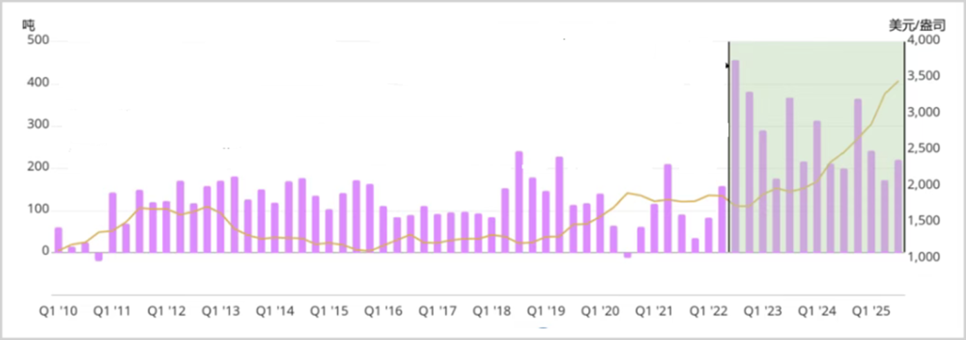 2025 年 4 月底之前的那一轮金价狂飙,主要推动力来自全球央行的持续购金行为。数据显示,仅中国央行在 2025 年前四个月累计增持黄金 48 万盎司,而随后六个月的增持速度有所放缓,累计增持 32 万盎司。