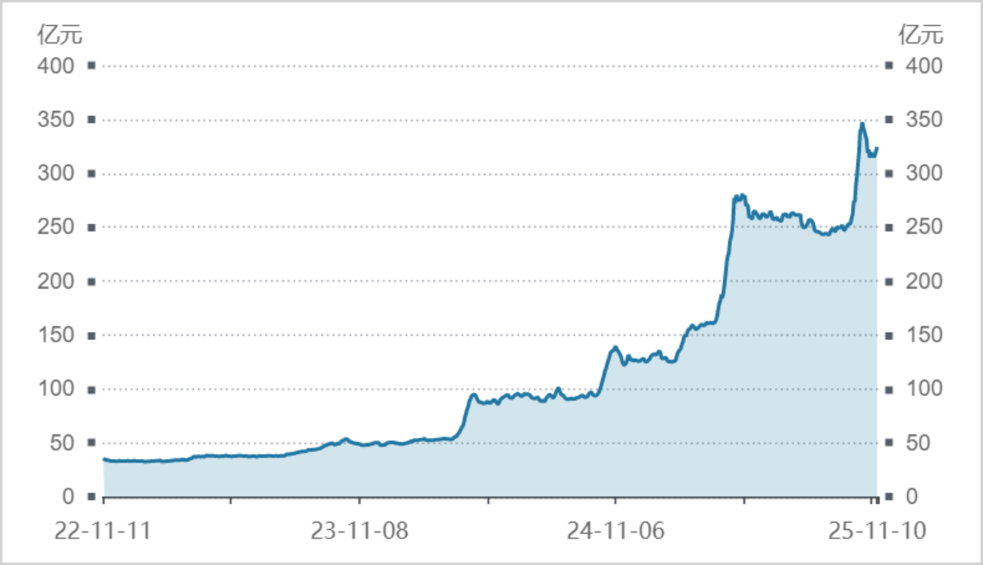 其中,截至11 月 12 日,黄金 ETF(159934,联接基金 A/C:000307/002963)流通规模高达 332.46 亿元,较 2024 年 3 月飙升五倍之多,成为全市场流动性较好的主力基金之一。