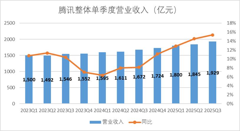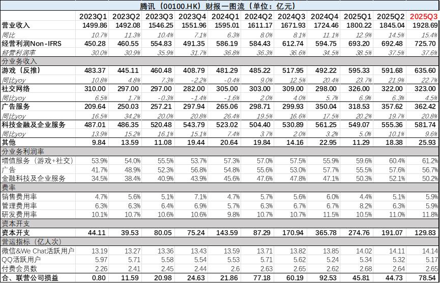 财报显示,腾讯本季录得营收 1928.7 亿元,超出市场预期逾 42 亿,同比增速达 15.4%;经营利润 725.7 亿元,经营利润率稳居 37.6% 的高位。