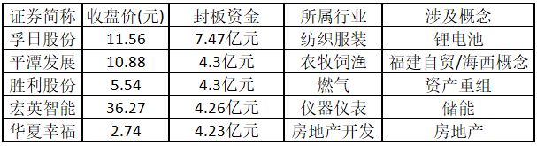 从封板资金来看,今日涨停板个股中,封板资金排名前 5 的个股包括孚日股份、平潭发展、胜利股份、宏英智能、华夏幸福。