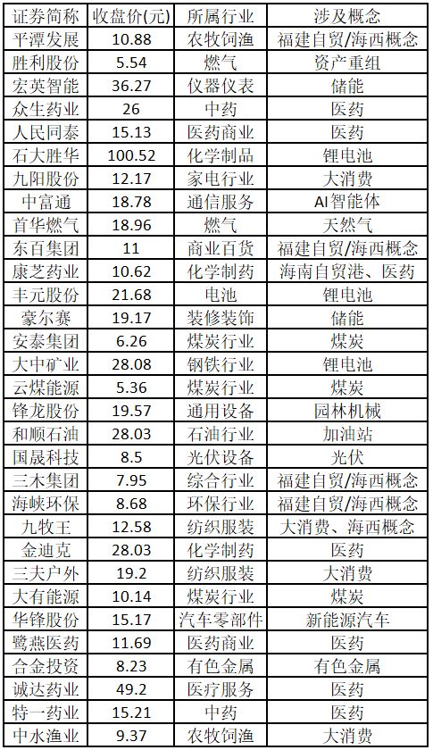 涨停板个股中,股价创出近一年新高的个股有 31 只 (不包括创出历史新高的个股),包括平潭发展、胜利股份、宏英智能、众生药业、人民同泰、石大胜华、九阳股份、中富通、首华燃气、东百集团、康芝药业、丰元股份、豪尔赛、安泰集团、大中矿业、云煤能源、锋龙股份、和顺石油、国晟科技、三木集团、海峡环保、九牧王、金迪克、三夫户外、大有能源、华锋股份、鹭燕医药、合金投资、诚达药业、特一药业、中水渔业,具体如下表所示。
