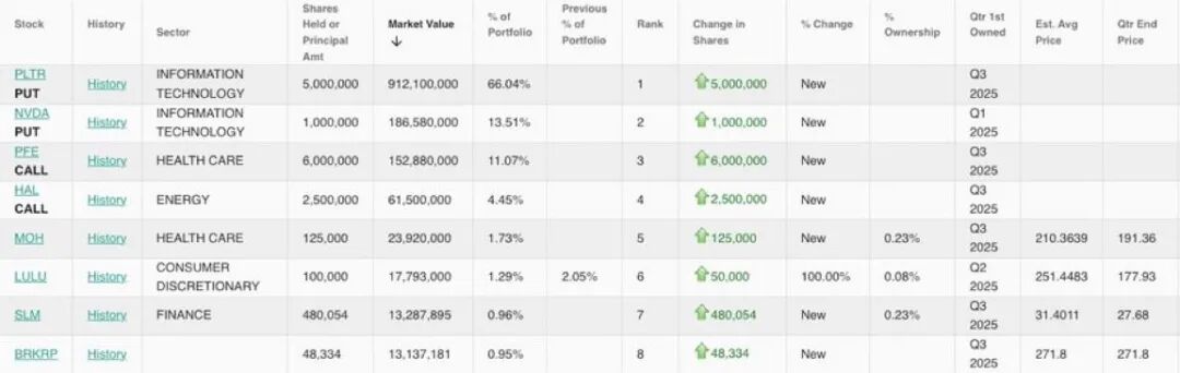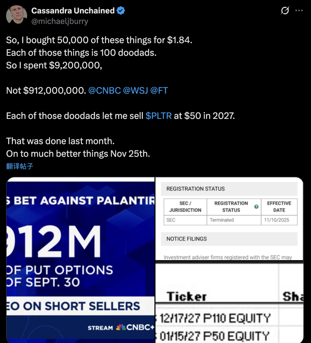另一边,“ 大空头” 迈克· 巴里在最新 13F 里亮出自己的新下注:买了 5 万张 Palantir 的看跌期权,行权价 50 美金,2027 年 1 月 15 日到期,期权成本 1.84 美金,总共掏了大概 920 万美金,对应名义敞口 9 亿多。