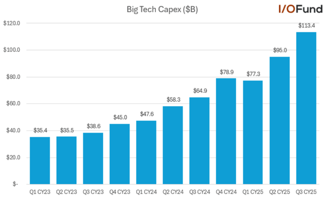 I/O Fund 给出了一组数据,把微软、谷歌、亚马逊、Meta 等几家大厂未来几年的 CapEx 预算加在一起:未来几年 Big Tech 在“AI 基础设施 (GPU、CPU、数据中心、电力) 上计划投入约 4050 亿美金”,单微软 2025 财年的 CapEx 就同比增长了 58%,达到 882 亿美金,而且管理层已经提示 2026 财年增长率还会更高。
