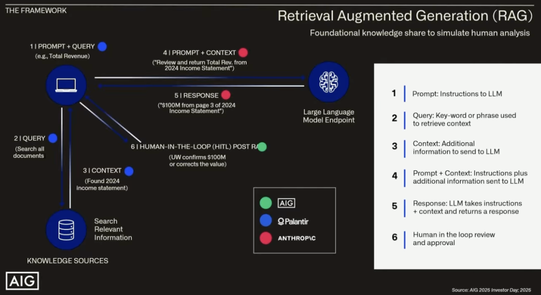 AIG 的故事类似,只是换成了核保。AIG 搭了一套生成式 AI 核保助手,底层用的是 Claude 这类大模型,调度和业务流程那一层交给 Palantir 来做,据他们自己的说法,核保效率提升了 3–5 倍,准确率从大约 70% 提升到了 90% 左右,关键是全链路可审计。