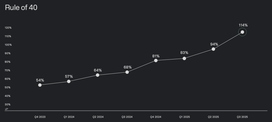 GAAP 净利润 4.76 亿美金,净利率约 40%,GAAP 营业利润率 33%,非 GAAP 营业利润率 51%;按 Investopedia 的算法,“Rule of 40” 达到了 114%。
