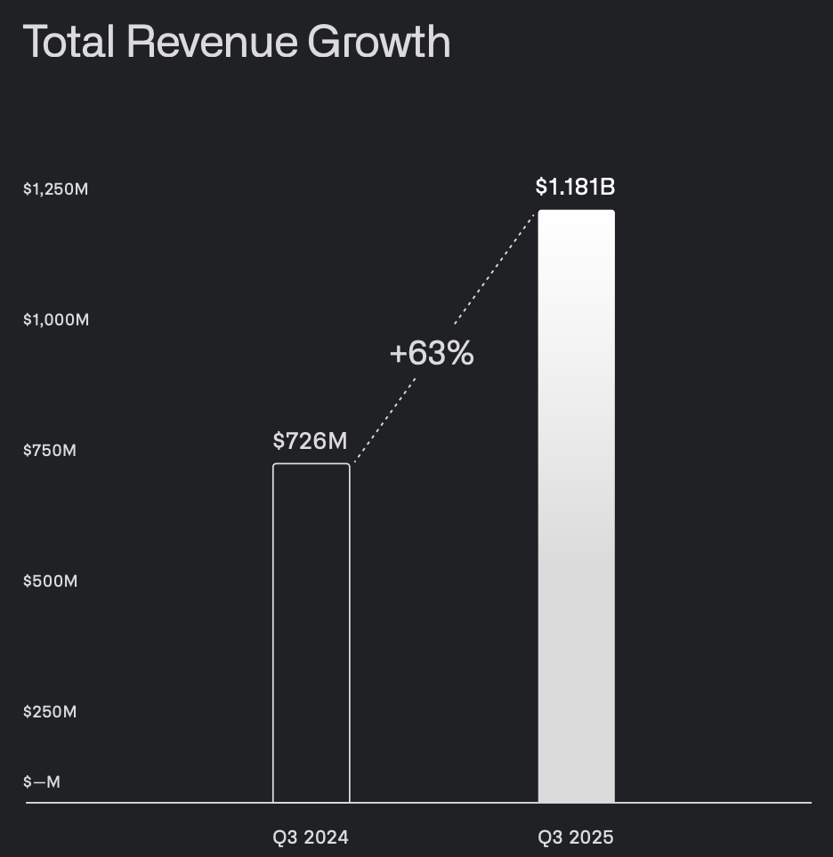 最新 2025 年 Q3 财报,Palantir 的几组关键数据是这样: