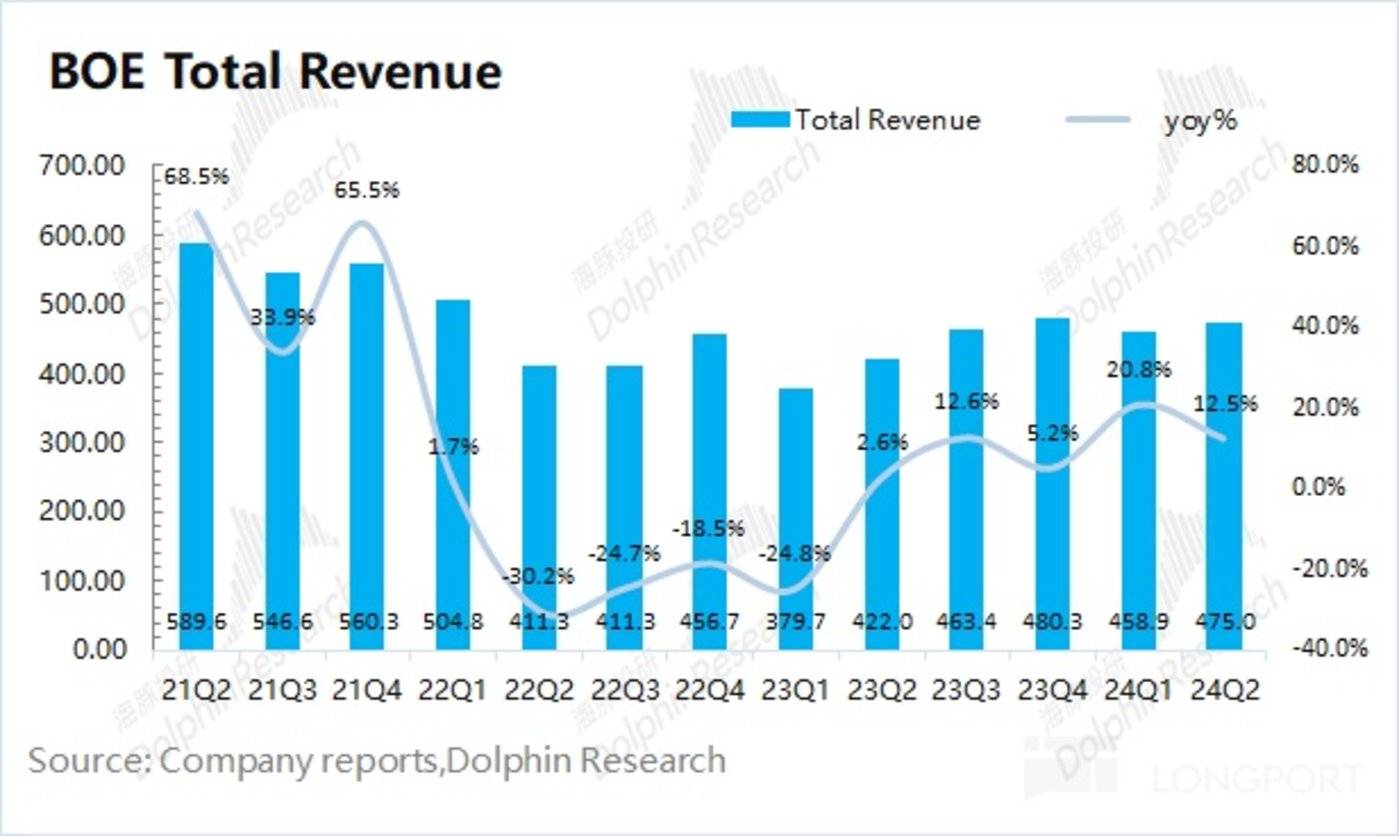京东方在 2024 年第二季度总营收 475 亿元,同比增长 12.5%,略低于市场预期 (487 亿元)。公司季度营收连续四个季度都达到 450 亿以上,在价格端持续提升的带动下,公司已经走出底部。