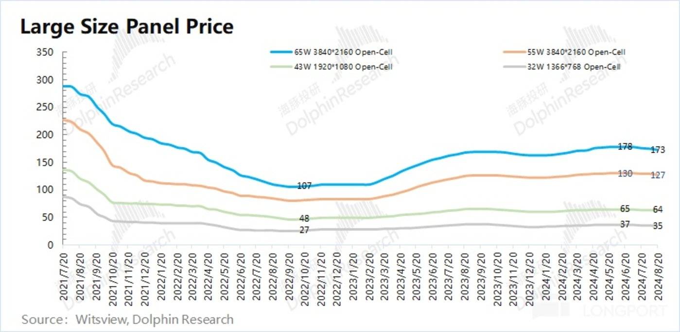 从 Witsview 的 8 月下旬报价来看,65 寸/55 寸/43 寸/32 寸价格分别为 173 美金/127 美金/64 美金/35 美金。各大面板的价格同比于去年同期,都有不同幅度的提升。