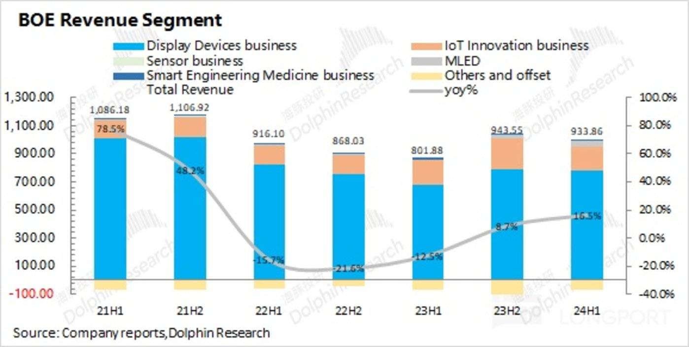 二、业务分项情况:显示器件是主要增长源。显示器件是京东方最大的收入来源,占比达到 8 成以上。2024 年上半年显示器件业务同比增长 14.87%,是公司增长的主要来源。在面板涨价的带动下,公司上半年显示器件业务的毛利率也回升至 13.9%,带动公司整体毛利率提升;