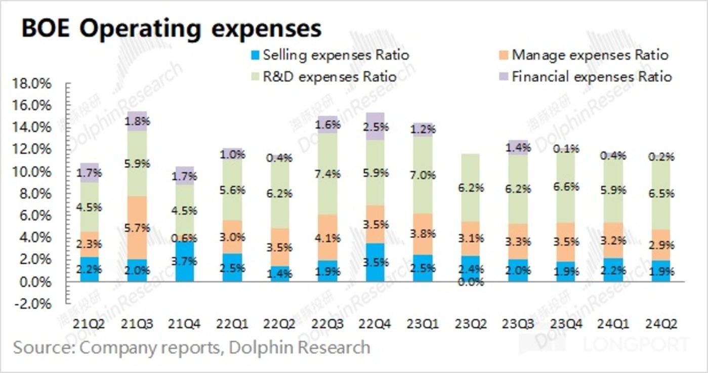 2024 年第二季度京东方四项费用合计 54.57 亿元,同比增加 11.4%。费用增长,主要来自于研发投入的增加。四项费用率 11.5%,由于收入端的增长,公司整体费用率有所下滑。