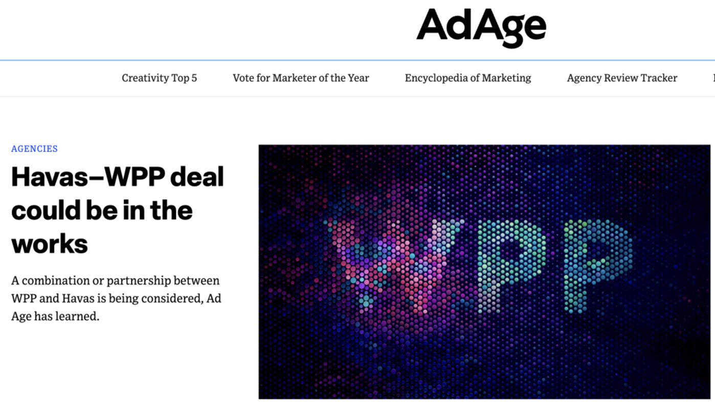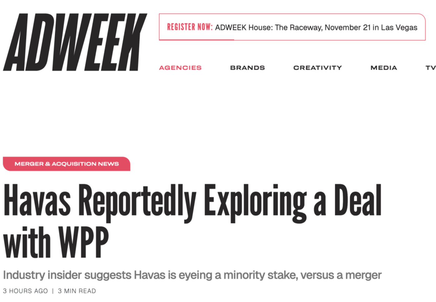 11 月 15 日,根据 AdAge、ADWEEK 的报道,法国广告集团 Havas 正在酝酿一笔针对 WPP 的交易。
