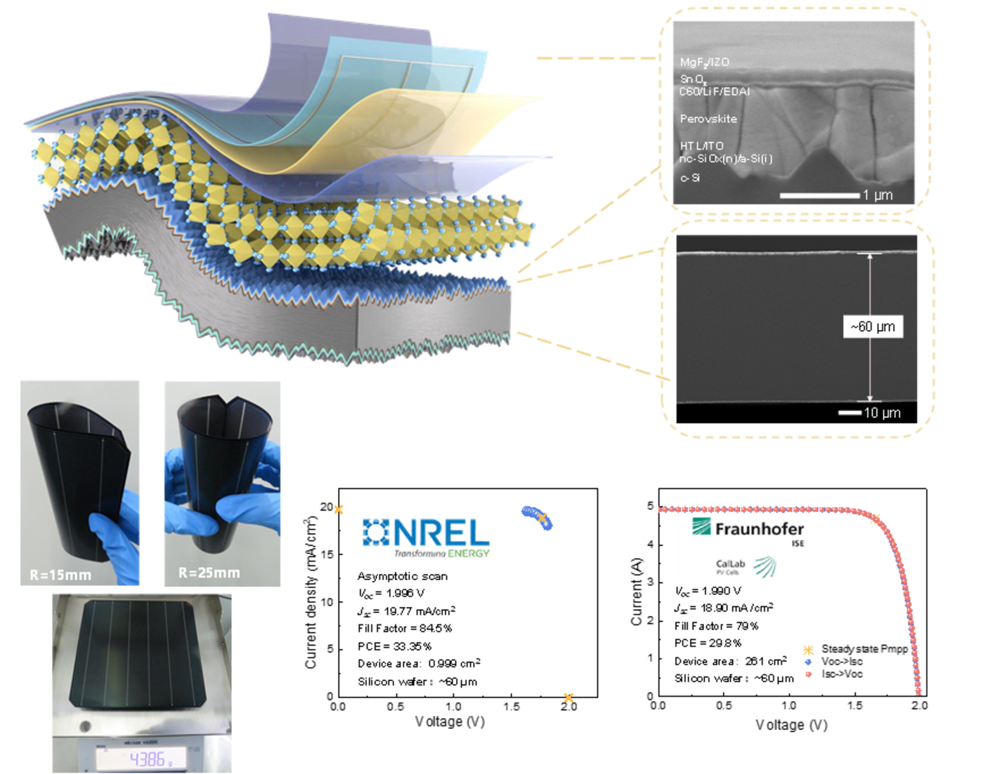 实验结果是:在超薄硅片上构建的柔性叠层器件,不仅可以实现小弯曲半径的反复弯折,而且在实验室小面积上做到了 33.4% 的转换效率,刷新了柔性硅基叠层电池的世界纪录。