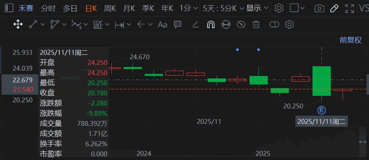 在 11 月 12 日,禾赛-W(02525.HK) 盘中一度大跌超 11%。