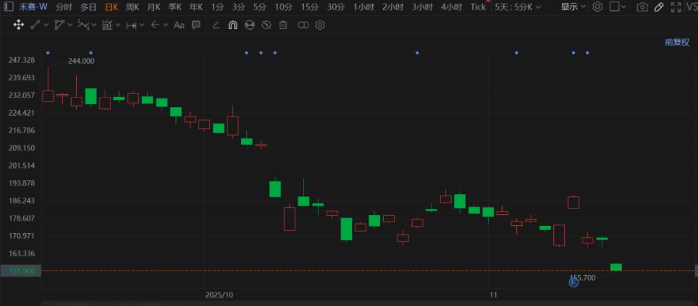 2025 年 9 月,禾赛才刚在港交所挂牌上市,是一家名副其实的新股。其上市当日股价曾达到 244 港元的高位,这对于估值水平一向审慎的港股市场而言,其定价显得尤为突出。但上市后仅约两月,禾赛股价便从高点下跌了约 1/3。