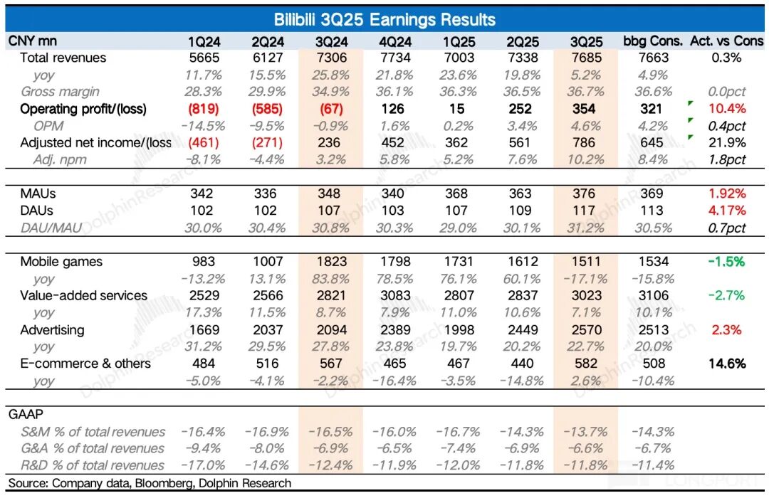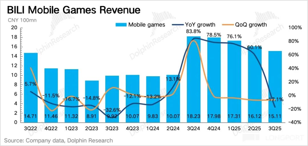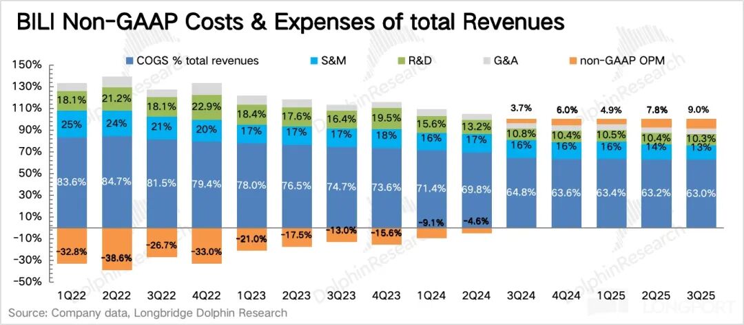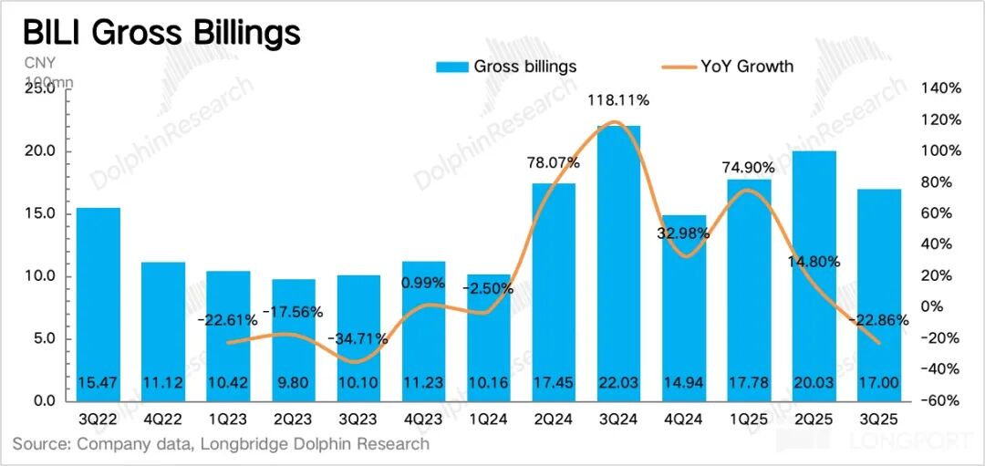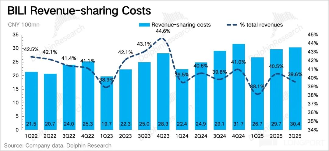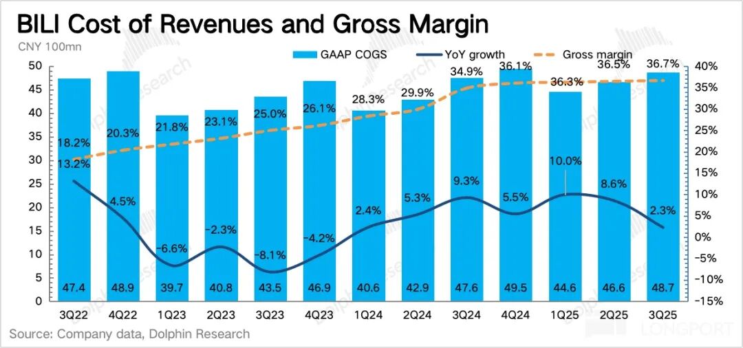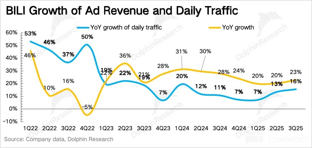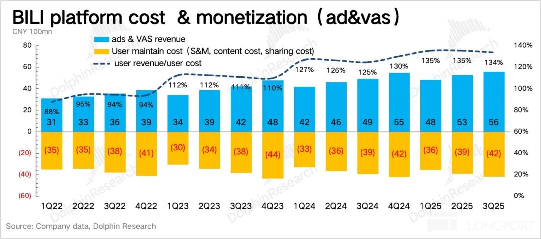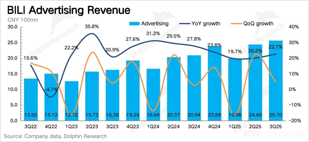 三季度 B 站广告收入超 25.7 亿,同比增长 22%,高于指引和预期。广告增长主要受益生态内用户时长增加 (+16%yoy),以及公司对广告算法、投放系统与 AIGC 创意工具的升级。其中,超过 50% 的广告素材已通过 AIGC 自动生成,显著提升制作效率与转化效果。