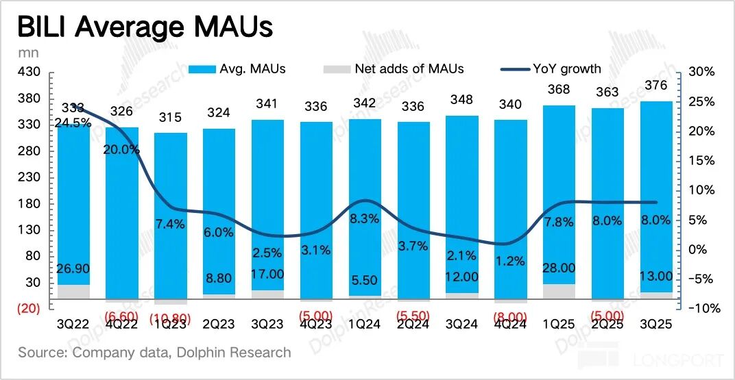 1. 用户生态健康扩张:这是海豚君认为的财报最大亮点。Q3 是暑假旺季,B 站月活 MAU 环比净增 1300 万人,DAU/MAU 提升至 31.2%。B 站生态的重新扩张从年初开始,去年因为 MAU 增长放缓,公司一度不再明列 MAU 指标,并引导市场关注 DAU。
