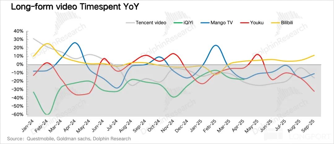 虽然在社交平台中时长没优势,但对比传统长视频平台,B 站还是吊打的。三季度,B 站出了本身的动漫内容外,自制综艺 《去你家吃饭好吗》 第三季、纪录片 《守护解放西 6》 以及 9 月末上线的古装复仇爽剧 《金昭玉醉》,均吸引了不少新增订阅。因此,行业中除了 B 站之外的长视频平台仍徘徊在 “ 水下”。