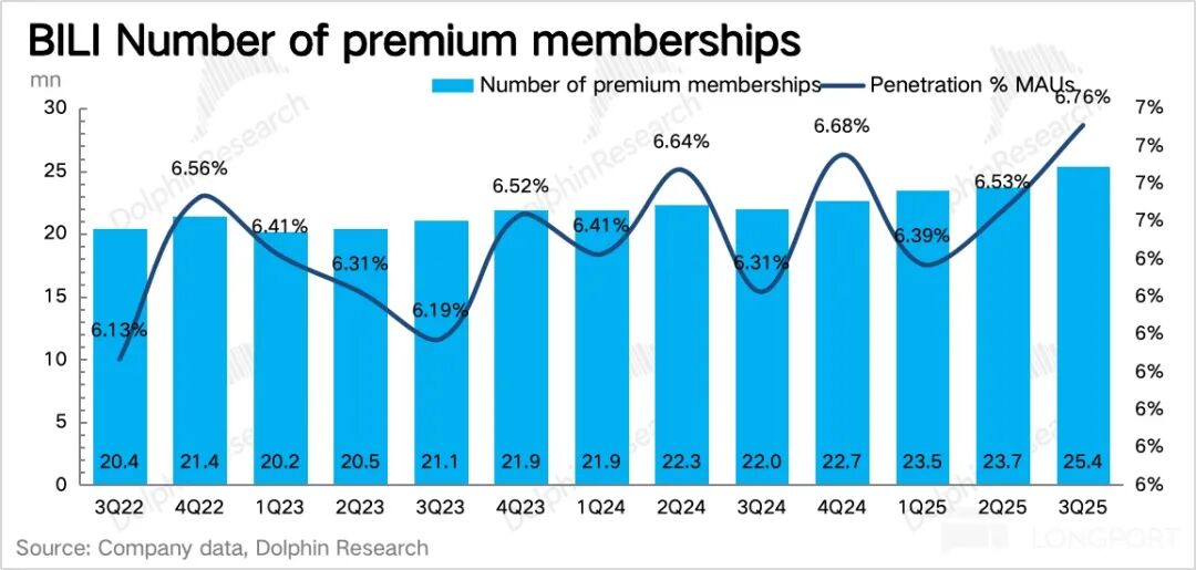 直播 + 大会员订阅为主的 VAS 增值服务收入,三季度同比增长 7%,环比增速显著放缓。