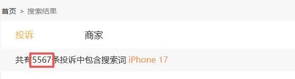 「TMT 星球」 又以“iPhone 17” 为关键词在黑猫投诉平台进行检索,结果显示,相关投诉量高达 5567 条,主要集中在产品有质量瑕疵、货不对板、超期不发货、售后服务差等方面。