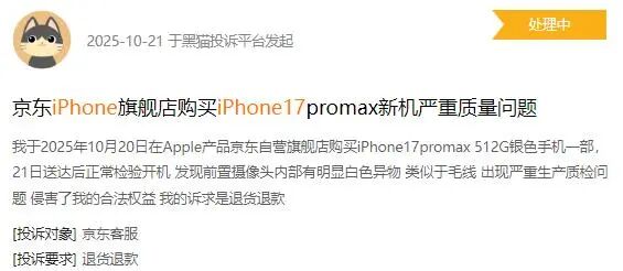 比如,有网友在黑猫投诉平台投诉称,其在 Apple 京东自营旗舰店购买的 iPhone 17promax 版手机,正常开机发现前置摄像头内部有明显白色异物,怀疑“ 出现严重生产质检问题”。