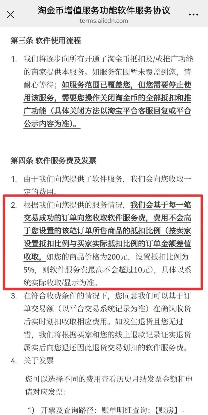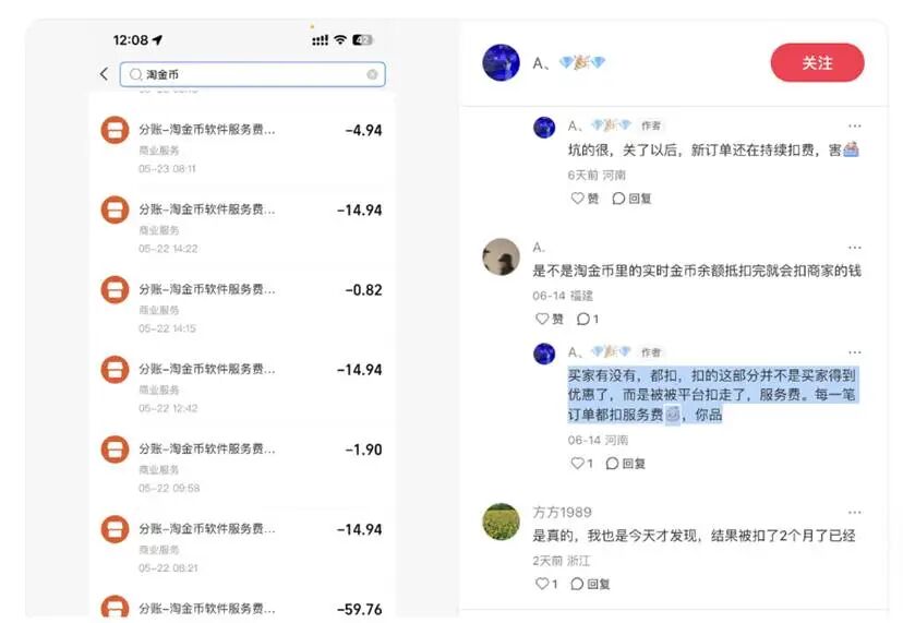 原本商家为用户提供的优惠额度,就这样变成了平台的“ 软件服务费”。根据这一新规,就算用户完全没有使用淘金币、一分钱没省,这笔服务费商家也要交,10% 的金额就全给了平台。