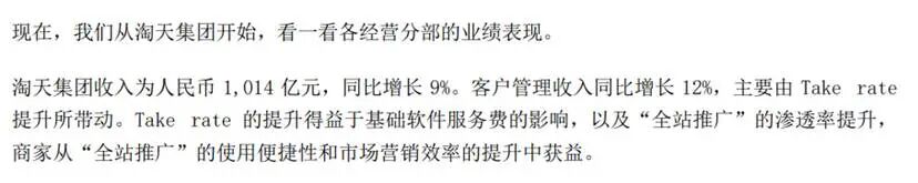 “ 客户管理收入同比增长 10% 至人民币 892.52 亿元 (124.59 亿美元),主要由 take rate 提升所驱动-这得益于去年 9 月新增的基础软件服务费以及全站推广的渗透率提升。”