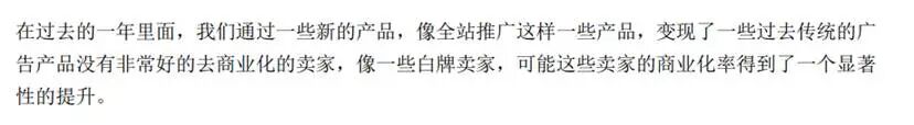 “ 在过去的一年里面,我们通过一些新的产品, 像全站推广这样一些产品,变现了一些过去传统的广 告产品没有非常好的去商业化的卖家,像一些白牌卖家。”