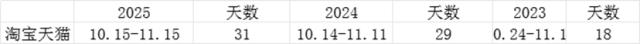 以淘宝天猫 (下称淘天) 为例:三年间,不算返场时间,双十一大促总时长从 18 天拉长到了 31 天,从双十一大促节,悄然变成了双十一大促月。