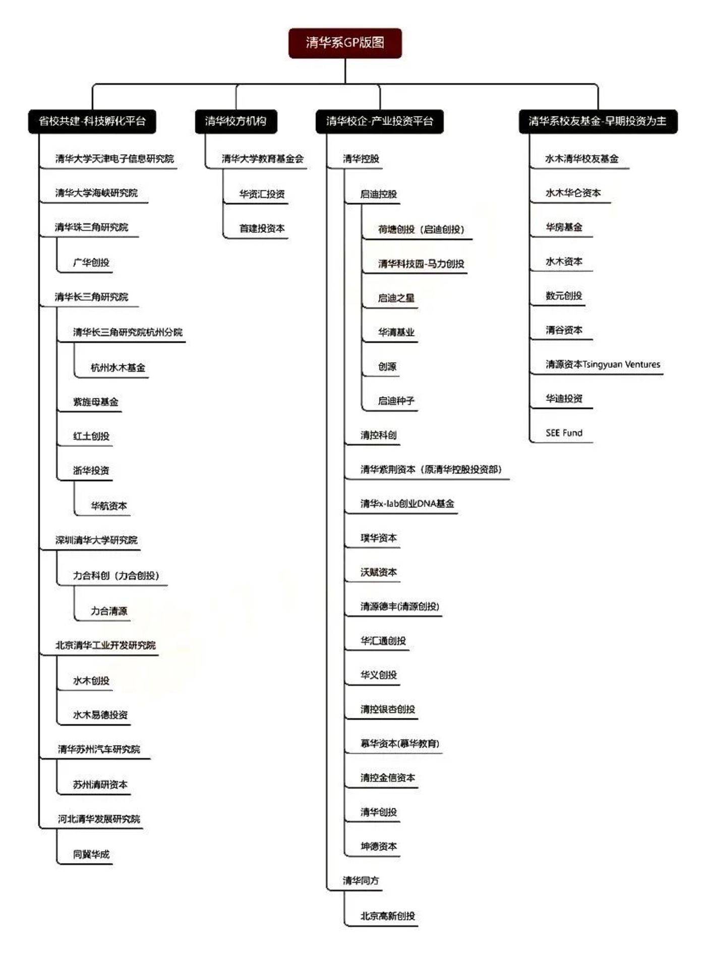 除上图中列出的校方主要参与的基金外,在创投圈,源码资本创始合伙人曹毅、英诺天使基金创始合伙人李竹、北极光创投创始管理合伙人邓锋、IDG 资本合伙人牛奎光、武岳峰资本创始合伙人潘建岳、源政投资董事长杨向阳、高成资本创始合伙人洪婧、国科嘉和执行事务合伙人陈洪武、紫荆资本董事长沈正宁、华创资本创始合伙人吴海燕……等一众投资人均来自清华。