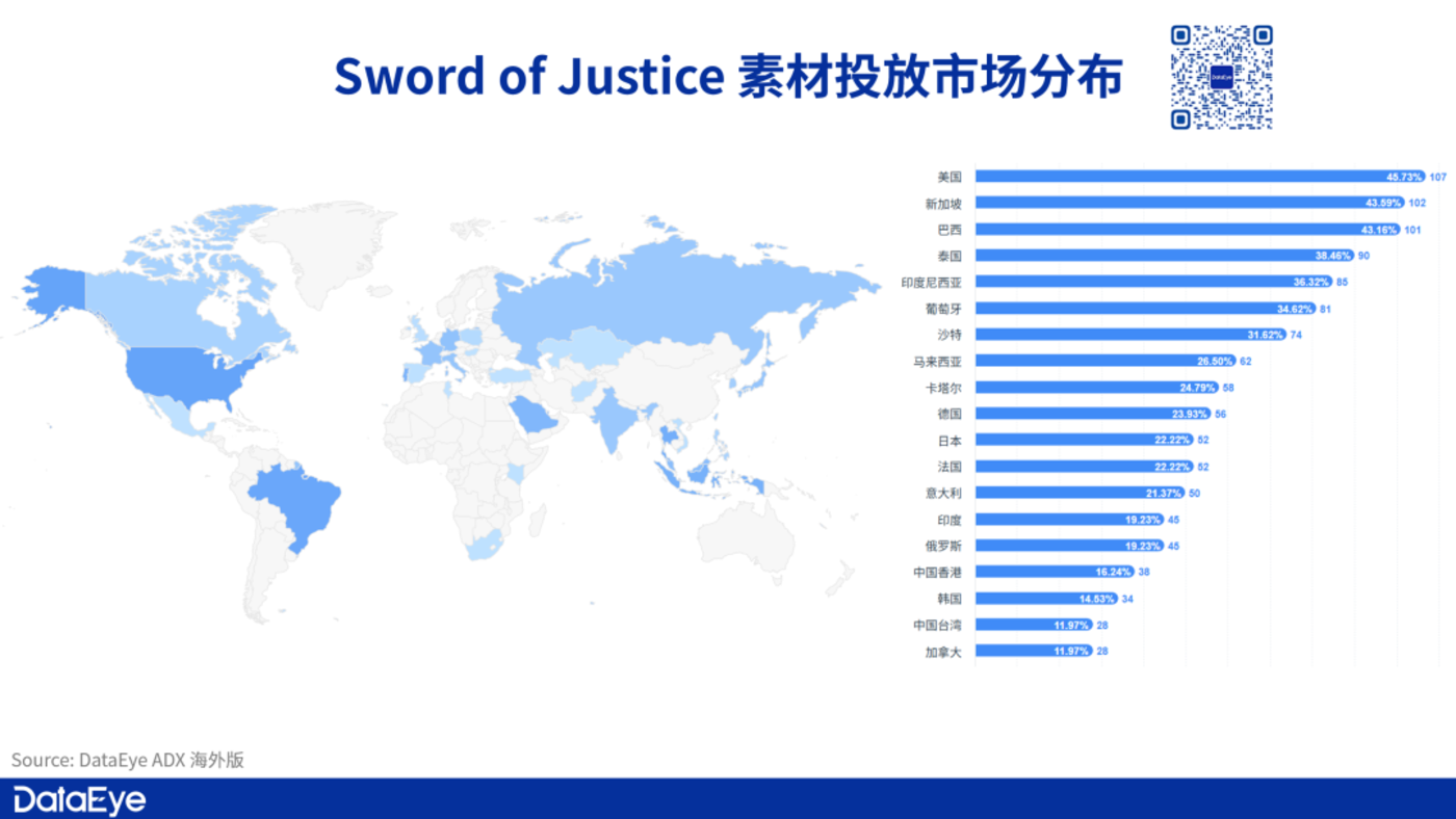 DataEye-ADX 海外版数据显示,除日韩版外 《Sword of Justice》 安卓版在全球的素材投放市场上,美国市场以 37.96% 的占比排第一。其次是新加坡、巴西和泰国市场。