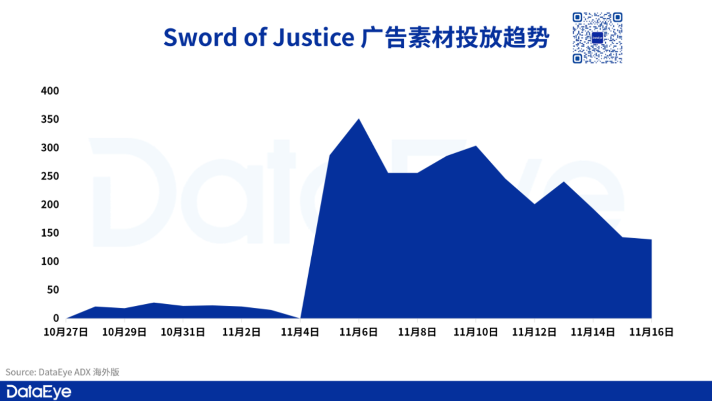 DataEye-ADX 海外版数据显示,除日韩版以外的 《Sword of Justice》 除了在 2025 年 9 月份有投放过数组素材后,其正式开启投放从 10 月 28 号开始。而游戏的广告投也不算 「大量级」——目前单日投放素材最高达到 300 组,上线首周每日平均投入 242 组广告素材。