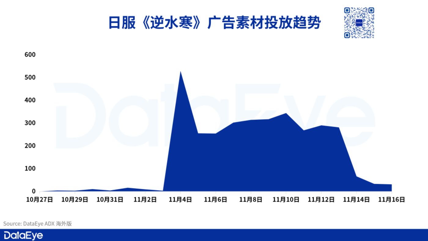 而虽然游戏的日服版本在单日平均投放素材数上比起全球服要稍低,但其在上线当日投放高峰超过 500 组,爆发性推高趋势更加明显,也能看出网易游戏对日服表现的重视。《逆水寒》 在日本上线首周累计投放广告素材数已超过 3330 组。